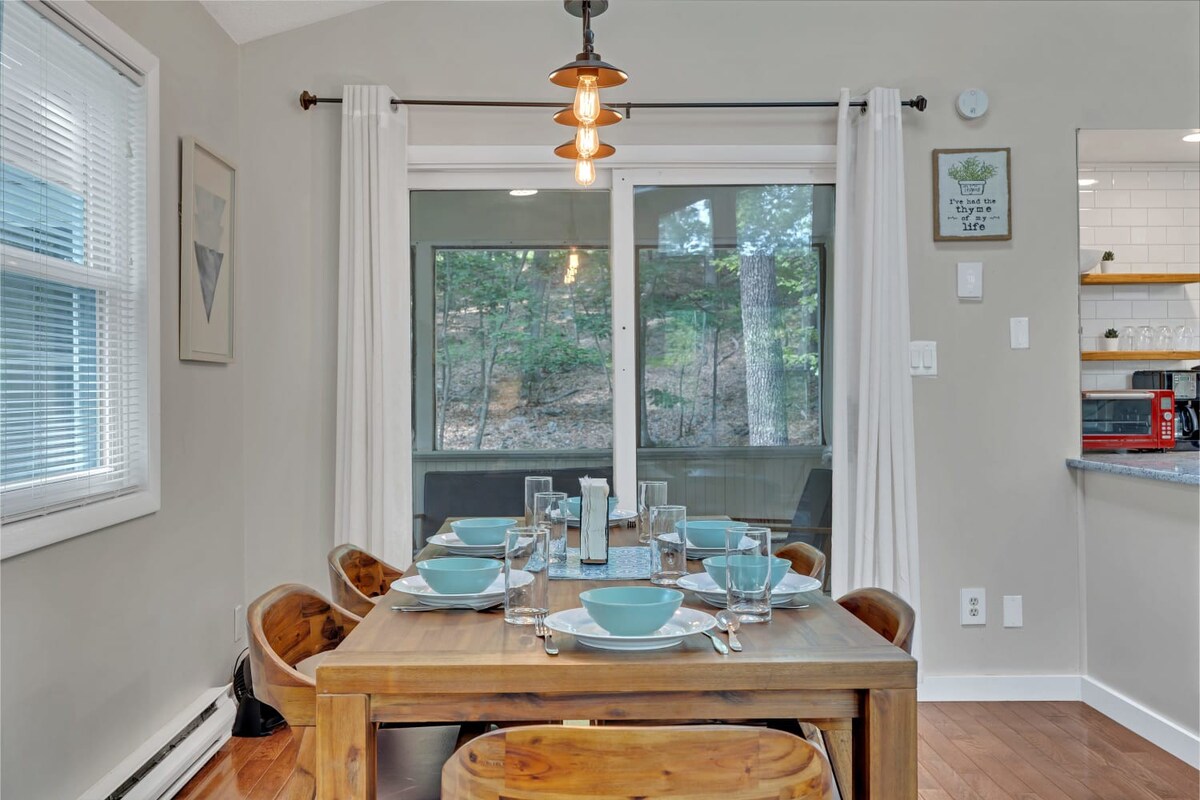 The kitchen comes fully stocked and equipped, with everything you need to prepare meals for your group. Brew fresh coffee in the morning with either a traditional coffee pot or Keurig machine, and enjoy complimentary coffee and tea to start your day right. When it’s time to gather, the open layout makes it easy to enjoy meals together, whether indoors or out on the deck under the trees.